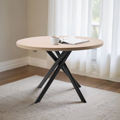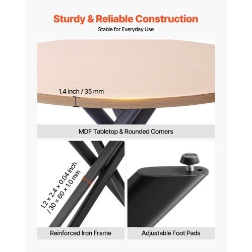 Table Board Details: 1.4 inch / 35 mm melamine board (laminatedthick panel),Main Materials: Table: Iron Tubes + MDF Board; Chairs:Iron Tubes + PU Leather,Chair Board Details: Plywood + Foam + PULeather,Chair Cushion & Backrest: Materials: Iron Tubes, Plywood,Foam, PU Leather; Surface Finish: PU Leather Cover,Item ModelNumber: DA1503 (Table) + DA2502 (Chairs),Chair Frame: Material:Iron Tubes; Surface Finish: Powder Coating,Main Colors: Table:Natural Wood Tone; Chairs: Orange,Net Weight: Table: 55.1 lbs / 25kg, Chair: 10.1 lbs x 4 / 4.6 kg x 4,Table Dimensions (Diameter xHeight): φ45.3 x 30 inch / φ1150 x 750 mm,Chair Dimensions (L x W xH): 22 x 18.7 x 31.9 inch / 560 x 475 x 810 mm
