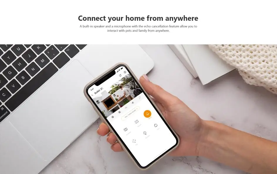A built-in speaker and a microphone with the echo cancellation feature allow you to interact with pets and family from anywhere.