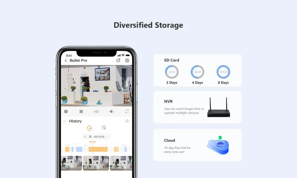 Video is easily stored and accessed through SD card, NVR or Cloud Storage.