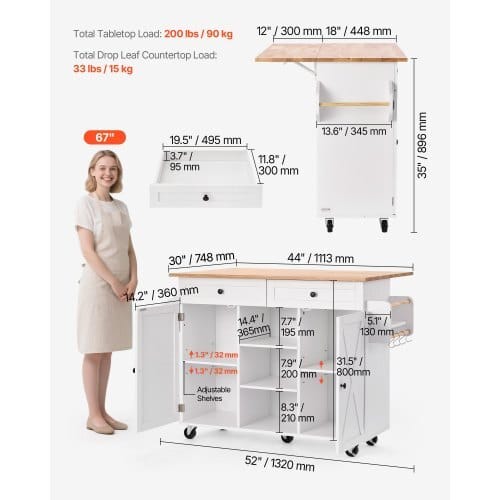 VEVOR Kitchen Island Cart, with Solid Wood Top and Storage Cabinet,Mobile Rolling Table with Drop Leaf, Drawers, Spice Towel Rack,Portable Islands on Swivel Wheels for Dining Room, 52in Width,White