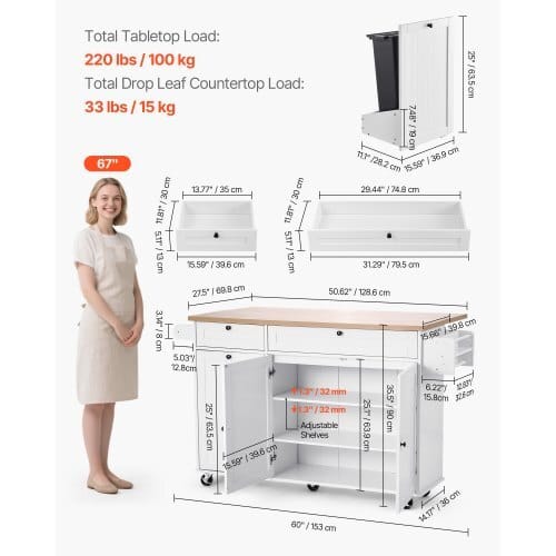 Total Drop Leaf Countertop Load: 33 lbs / 15 kg,Total Drawer Load:15 lbs / 7 kg,Item Model Number: YS252253ss,Material: MDFBoard,Total Tabletop Load: 220 lbs / 100 kg,Total Shelf Load: 40lbs / 18 kg,Item Weight: 104 lbs / 47 kg