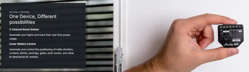 Shelly 2PM Gen3 is a smart switch with dual-channel control, power metering, and cover control. Remotely control and monitor two different electrical circuits, or roller shutters, blinds, and other bi-directional motors from anywhere. Perfect for retrofitting standard electrical wall boxes, power sockets, and light switches, even in spaces with limited room.
