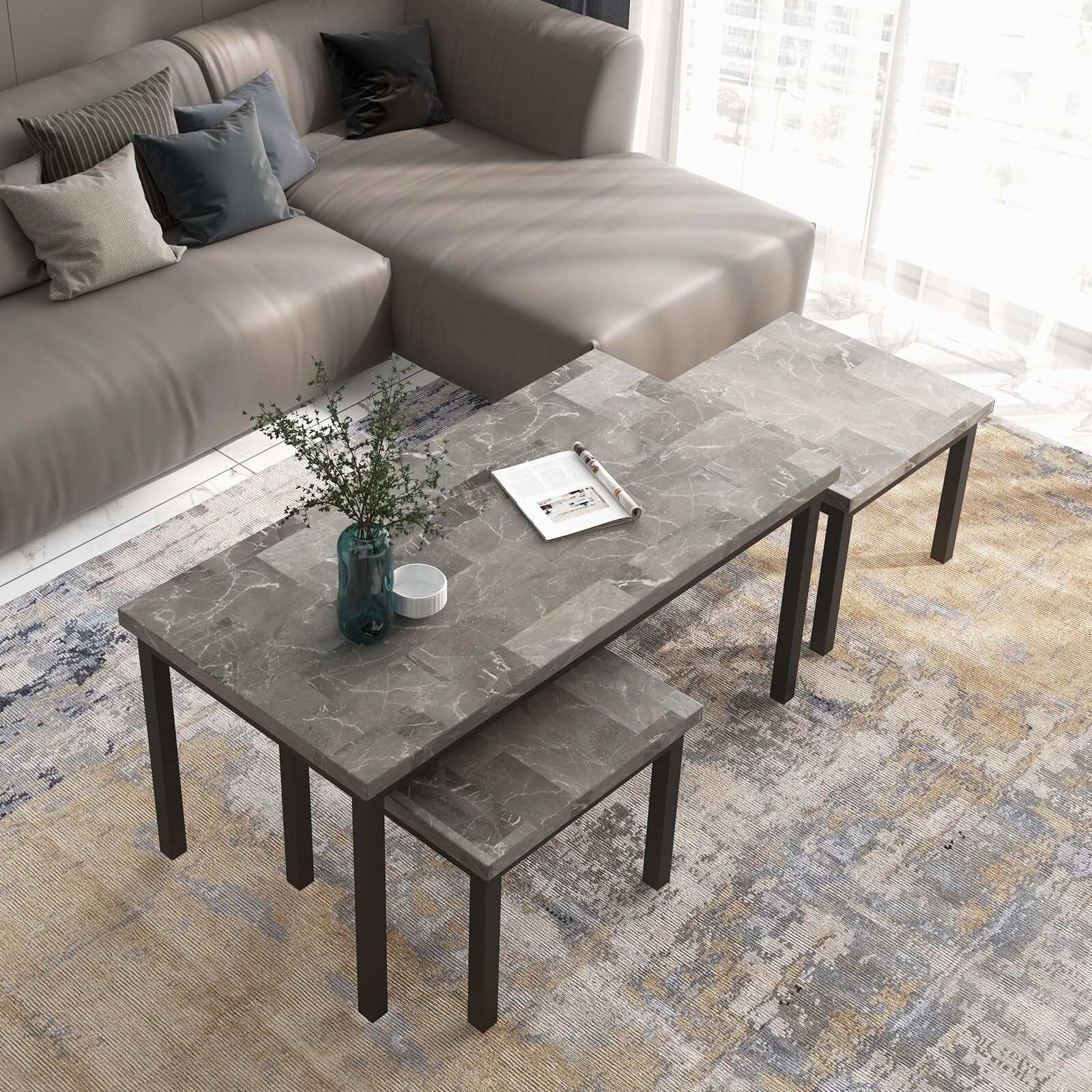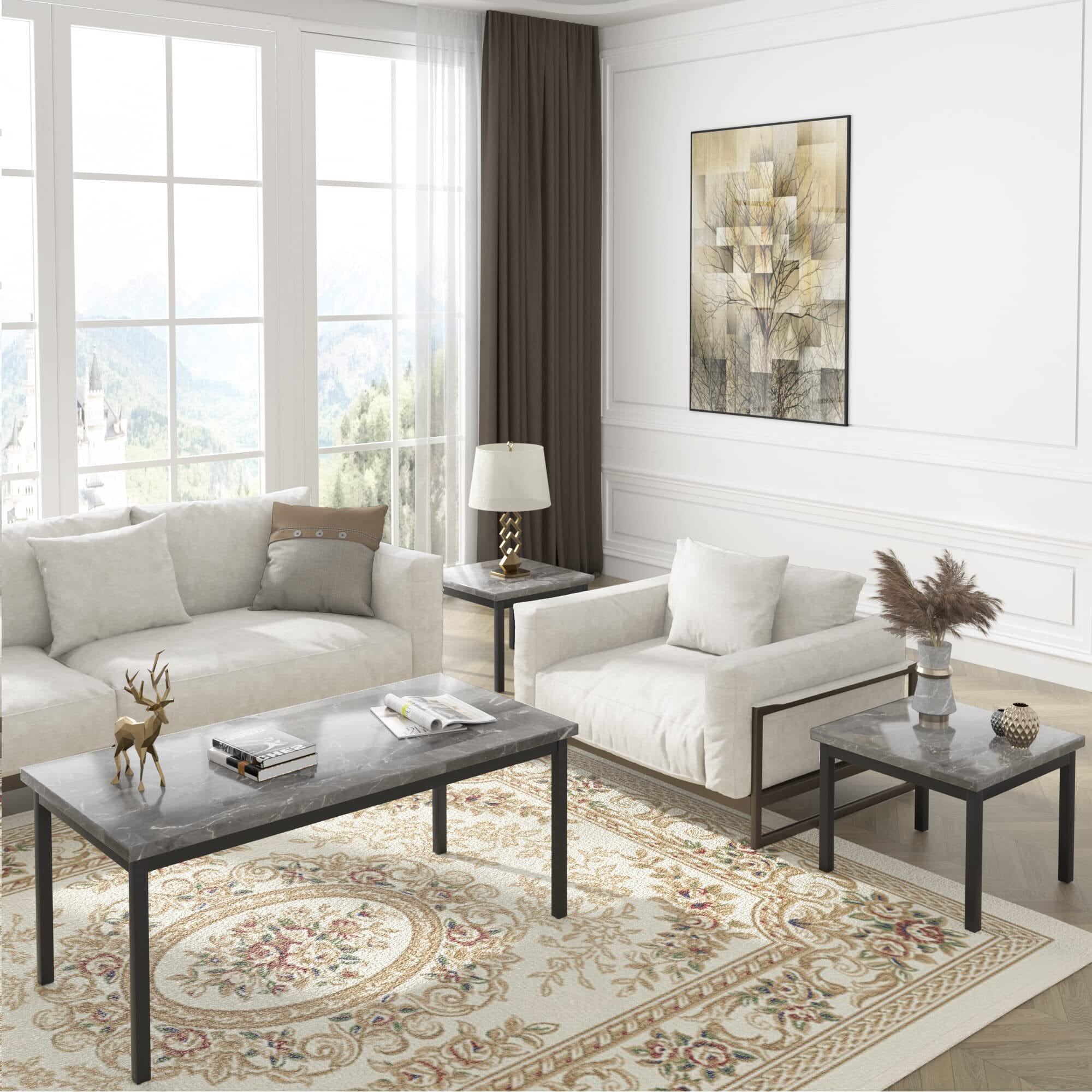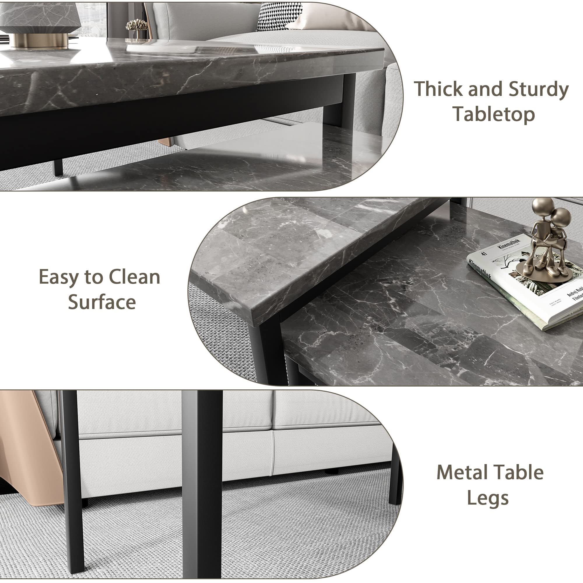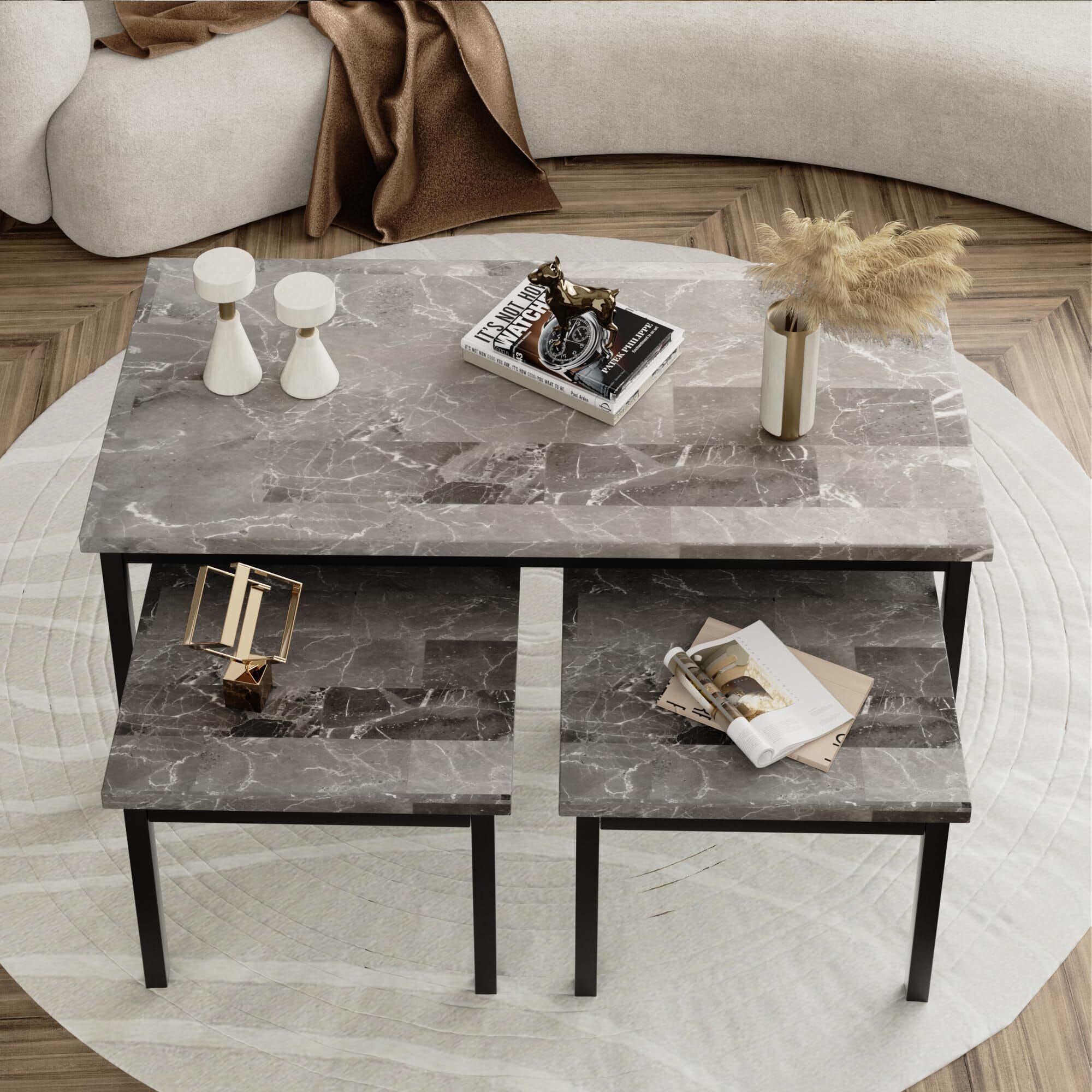 US GARVEE Living Room Table Set Large Rectangle Coffee Table & 2 Square End Side Tables Marble